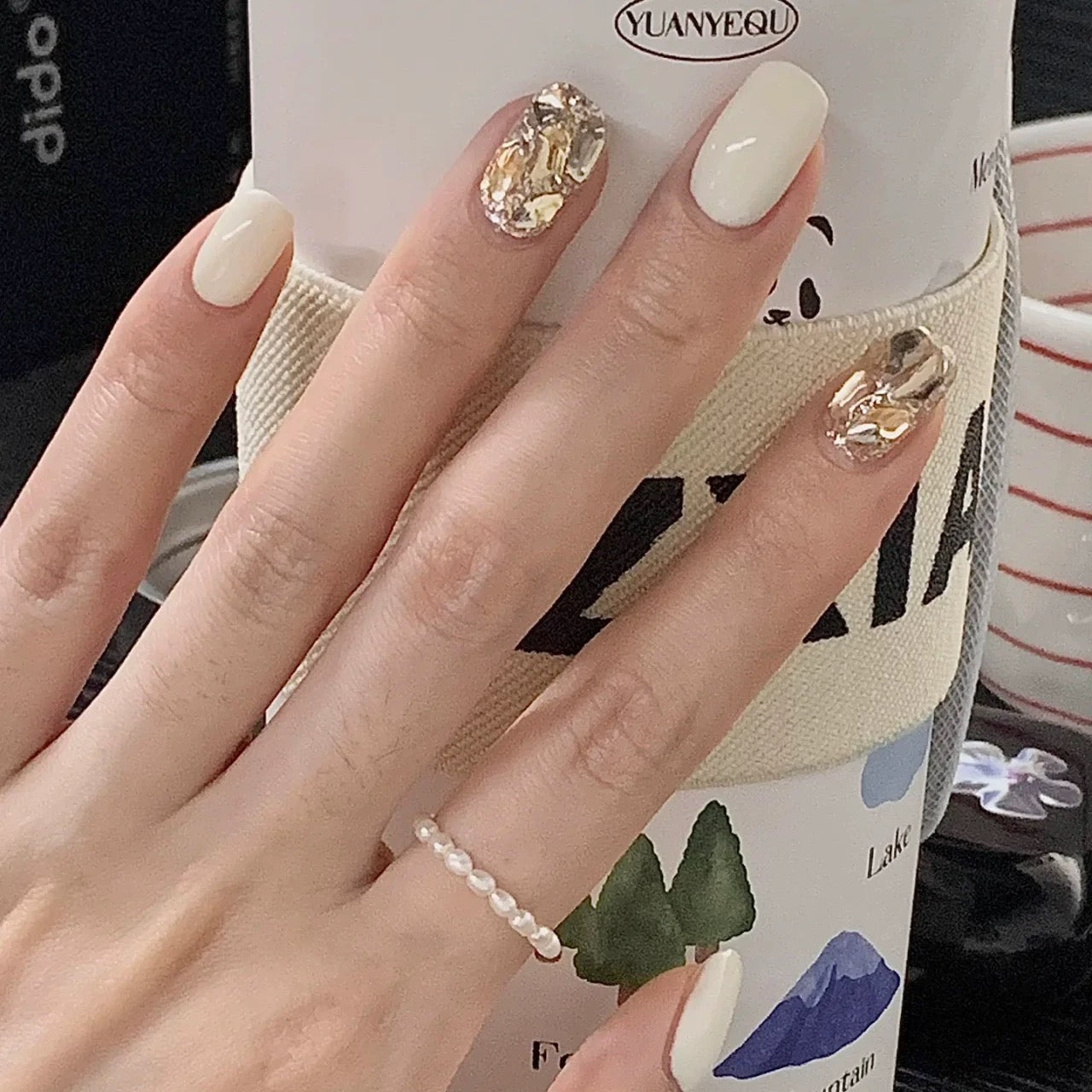 - Pattern Mix: Solid cream with metallic accent nails