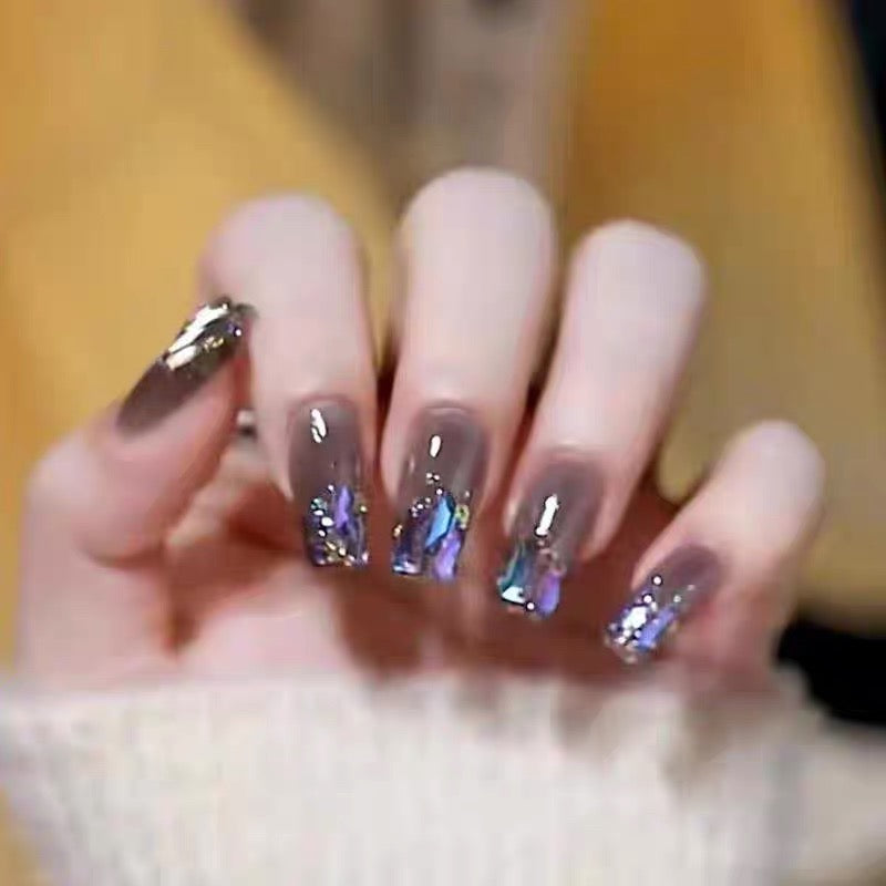 A mystical blend of smoky grey base with shifting aurora-like chrome effects in purple, blue, and teal. This design captures the ethereal beauty of the northern lights using innovative chrome pigments developed in Lumiere's Material Innovation Lab.