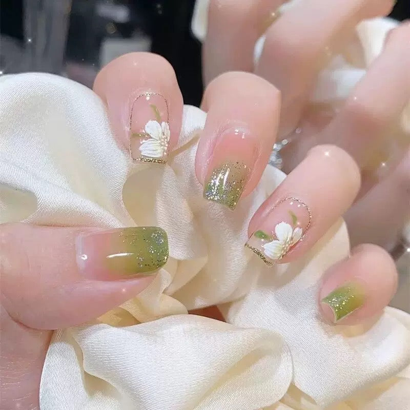 Created in Lumiere University's Botanical Design Studio, this ethereal set features a delicate blend of sage green ombré tips with hand-painted white florals and gold accents. The design captures the essence of early spring gardens, combining natural elements with elegant metallic details.