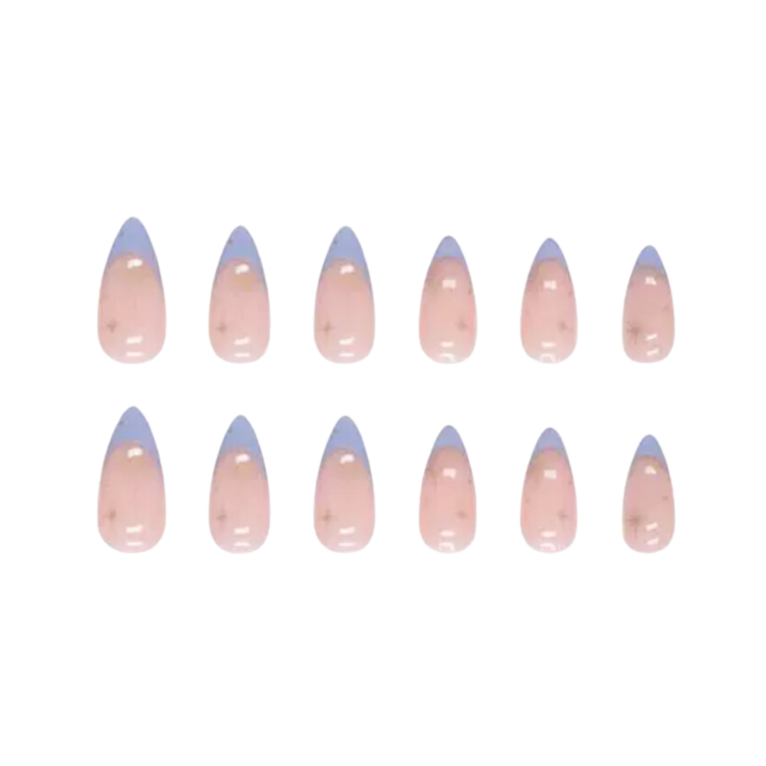 Inspired by Luna's late-night astronomy class collaborations at Lumiere University, these dreamy nails feature a soft nude-to-lavender gradient adorned with delicate gold star bursts. The design captures the magic of stargazing from the university's rooftop observatory.