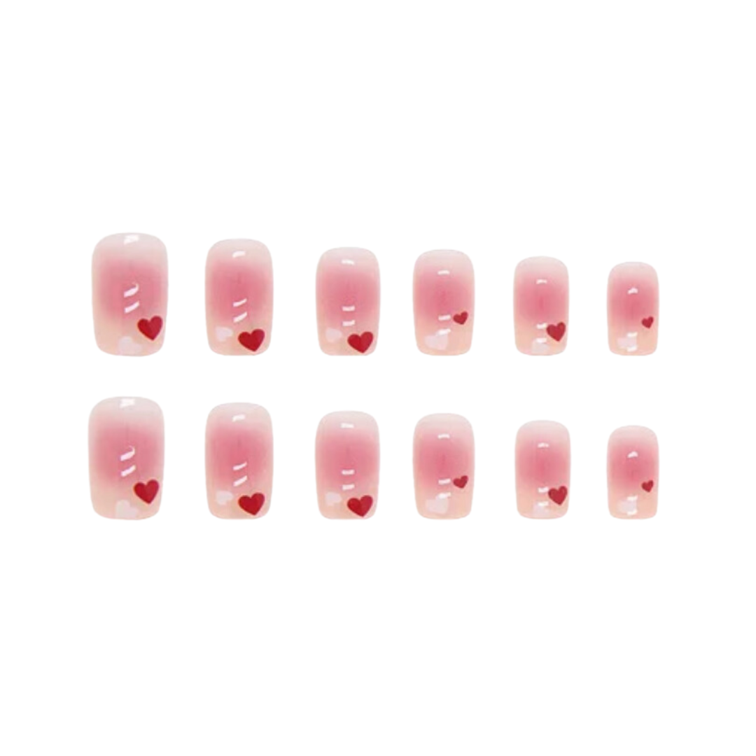 Designed during Lumiere University's Valentine's Pop-up Event, this delicate set features a romantic gradient base adorned with perfectly paired mini hearts. Each nail tells a sweet story of love with its subtle pink-to-clear transition and carefully placed heart details.
